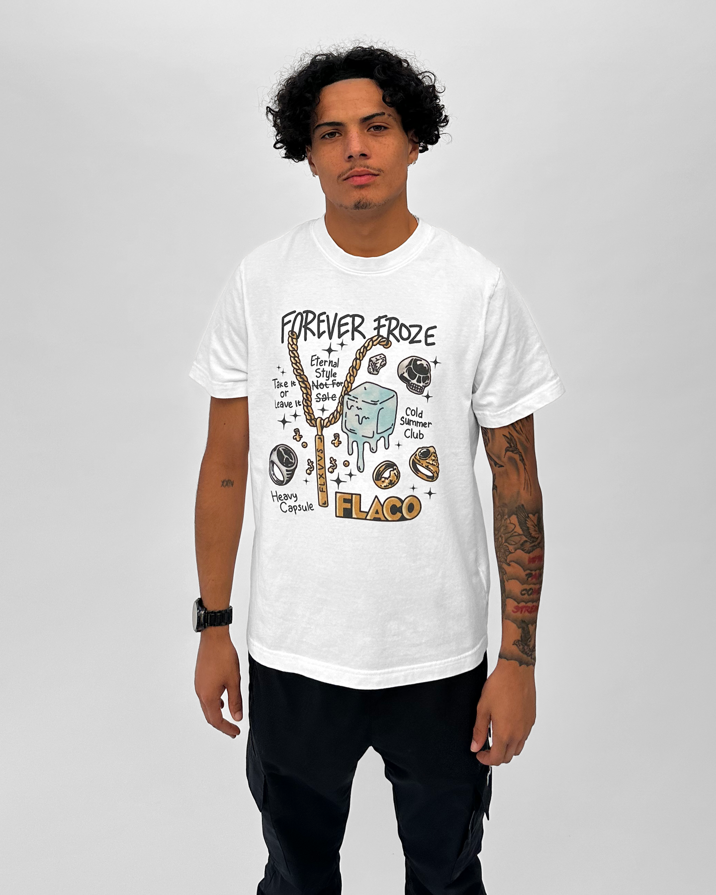 White oversized cut, true-to-size fit. Premium 100% organic cotton tee featuring our “Forever Froze” graphic — a collage of ice-cold motifs including jewellery, rings, skull, chain, and our signature cube.